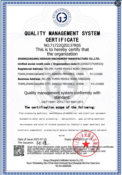张家港和顺机械制造有限公司成立于2001年,总占地面60000万平方米,总资产13000万元。员工50多人,其中中级职称以上的工程技术人员占28%,拥有博士科研团队1个,国家首台套项目1个,省级课题1个,是专业生产金属管材类加工机械设备的专业工厂,产品销售覆盖欧、美、东南亚各地。和顺机械是一家专注于金属管材成型设备研发和制造的企业,成功开发出国际领先的弯管机、激光切割机软件。